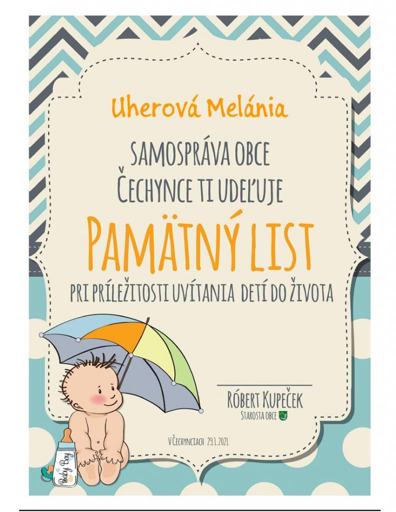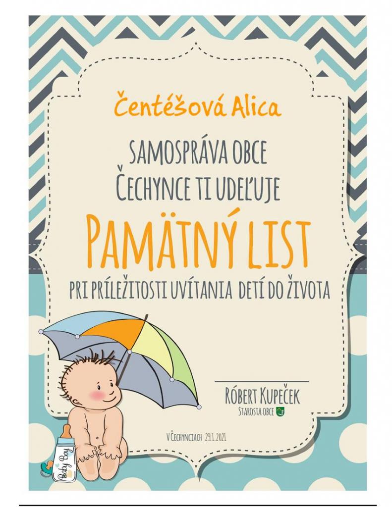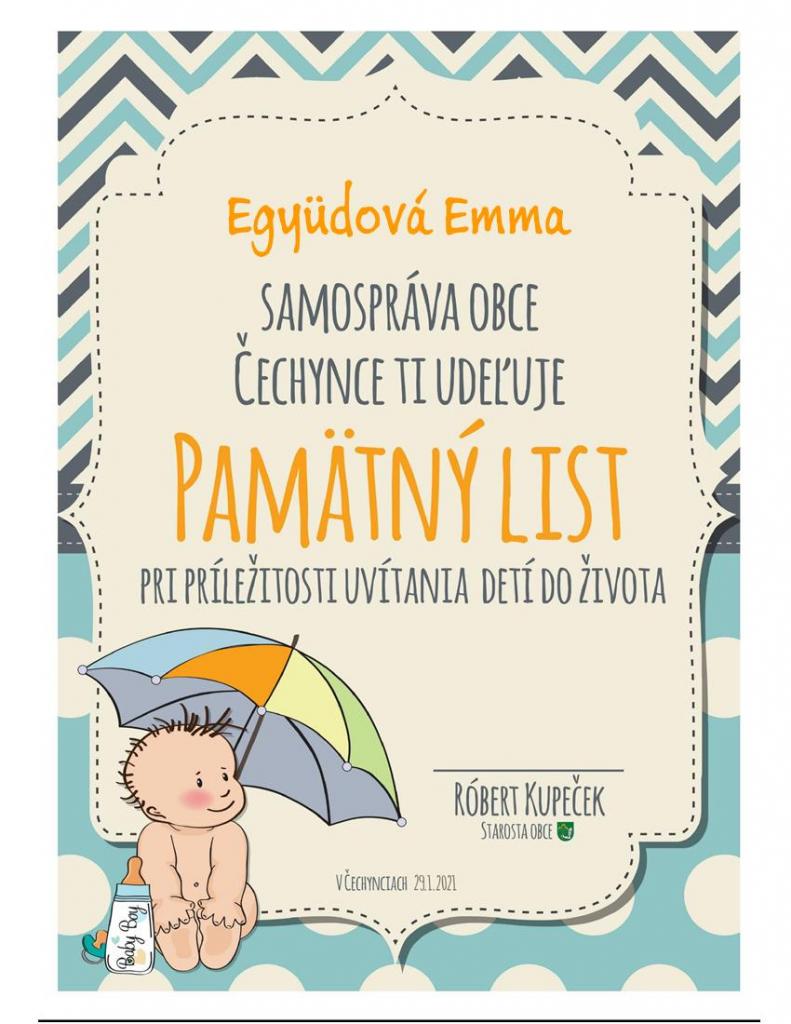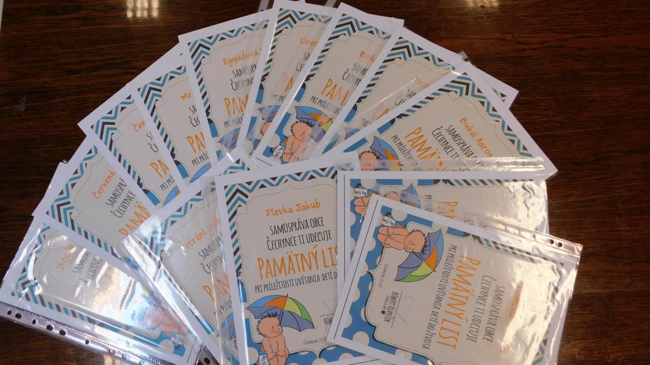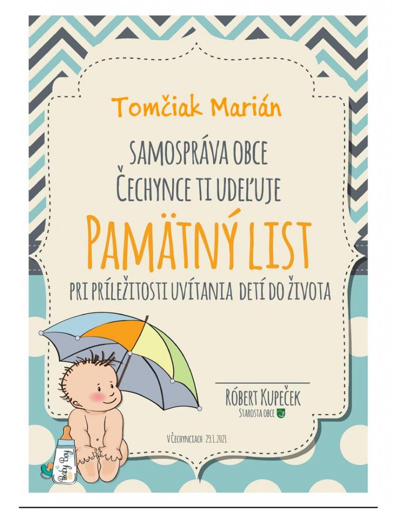 Prajeme Vášmu dieťatku, aby po celý život vnímalo, že je milované, že Vám na ňom záleží. Nech Vám vaša vzájomná dôvera a pochopenie v rodine pomôžu vytvoriť domov, ktorý vždy bude dýchať istotou, oporou a harmóniou. Želáme Vám, aby sa Vám ako rodičom v našej obci dobre žilo a aby Vaše deti prežili v Čechynciach najkrajšie detstvo aké sa len prežiť dá.