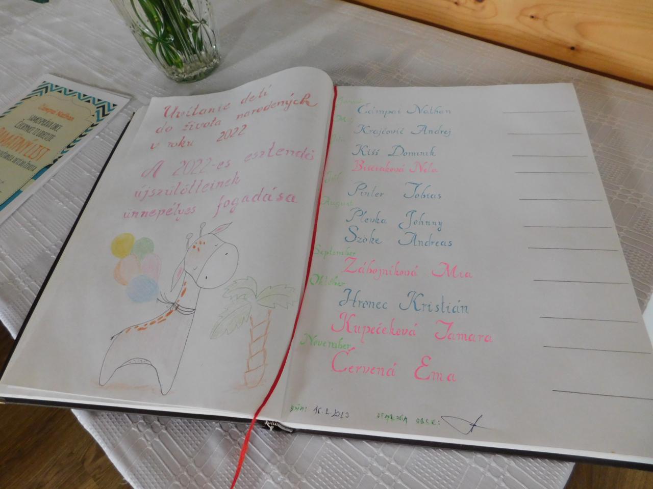 Az újszülötteket és szüleiket községünk polgármestere Kupeček Róbert üdvözölte és kívánt nekik jó egészséget és boldog gyermekkort . Az ünnepi délután a helyi iskolások műsorával kezdődött, majd a polgármester ünnepi köszöntője után a megjelent családok átvehették a helyi önkormányzat ajándékait.