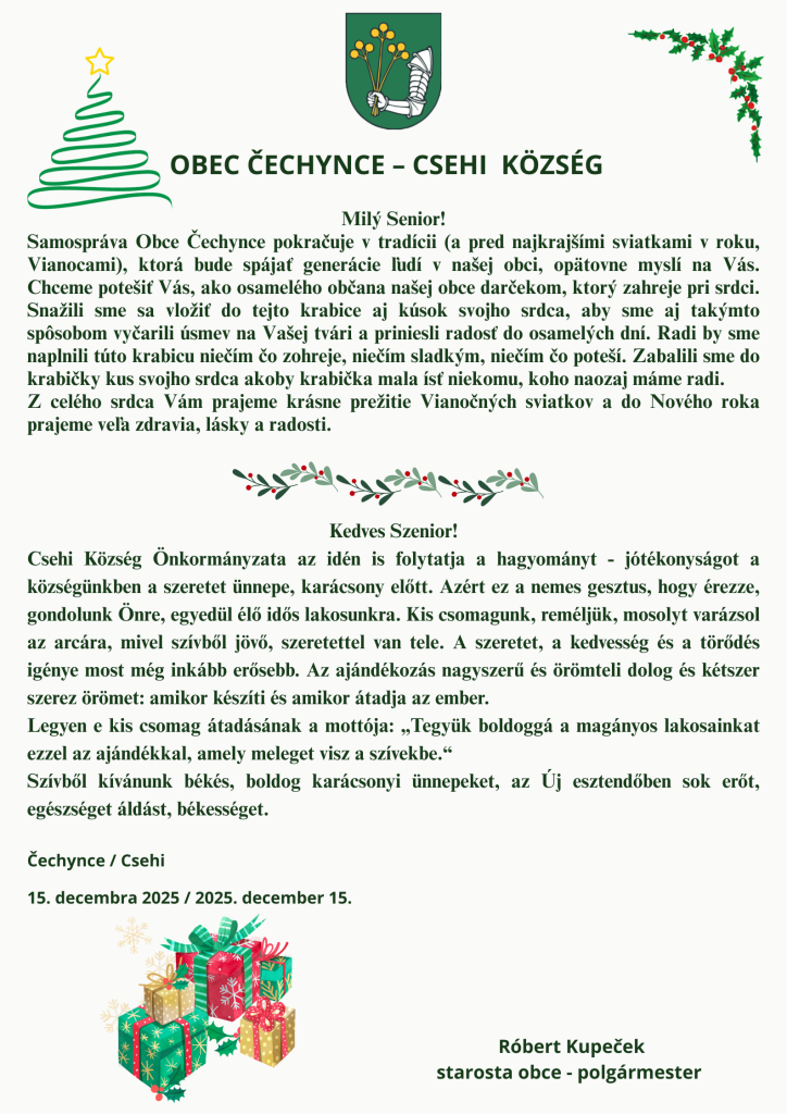Aj naša samospráva pokračovala v založenej tradícii a to pred Vianocami potešiť našich osamelých seniorov nad 70 rokov darčekom, ktorý zahreje pri srdci ich aj nás, preto sme naplnili krabice plné lásky. 7 mužov a 25 žien dostali od Občianského združenia „Koľko Lásky“ krabice naplnené láskou, lebo ich a aj našim poslaním je prinášať seniorom nielen radosť, ale aj pocit, že na nich záleží – že ich Jeseň Života môže byť plná lásky a spolupatričnosti. Krabice sme doplnili aj krásne ručne vyrobenými darčekmi od žiakov miestnej ZŠ a KC.