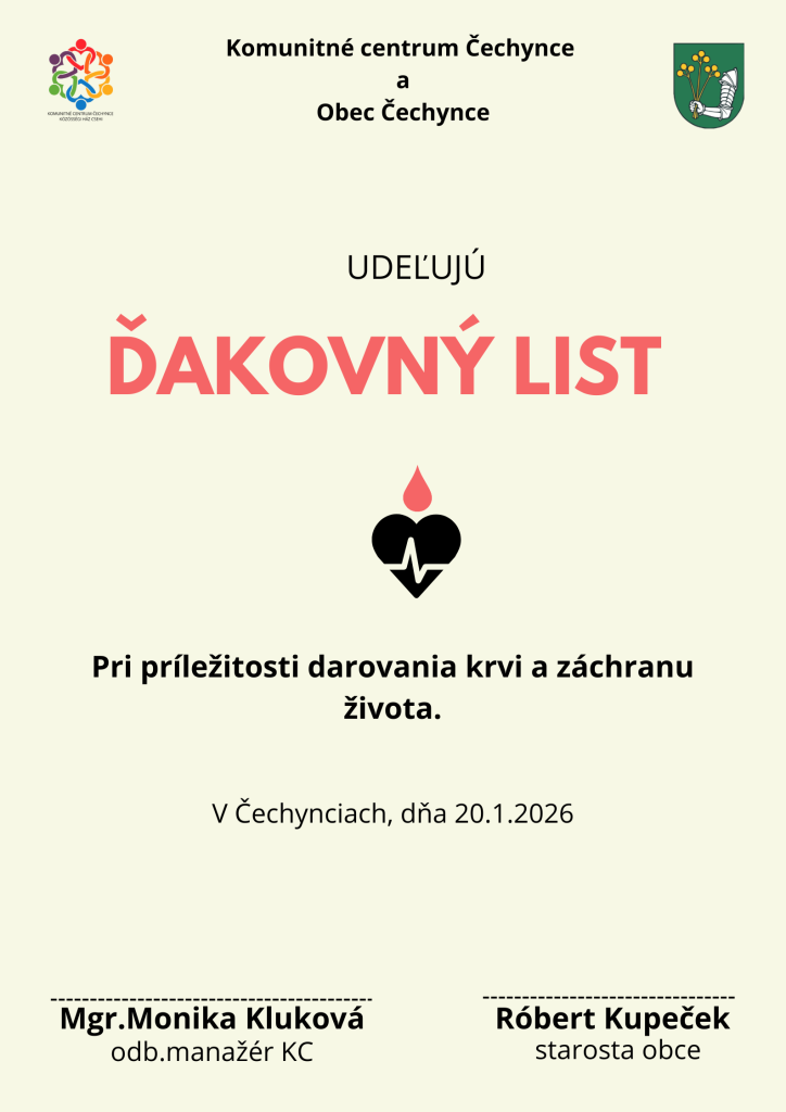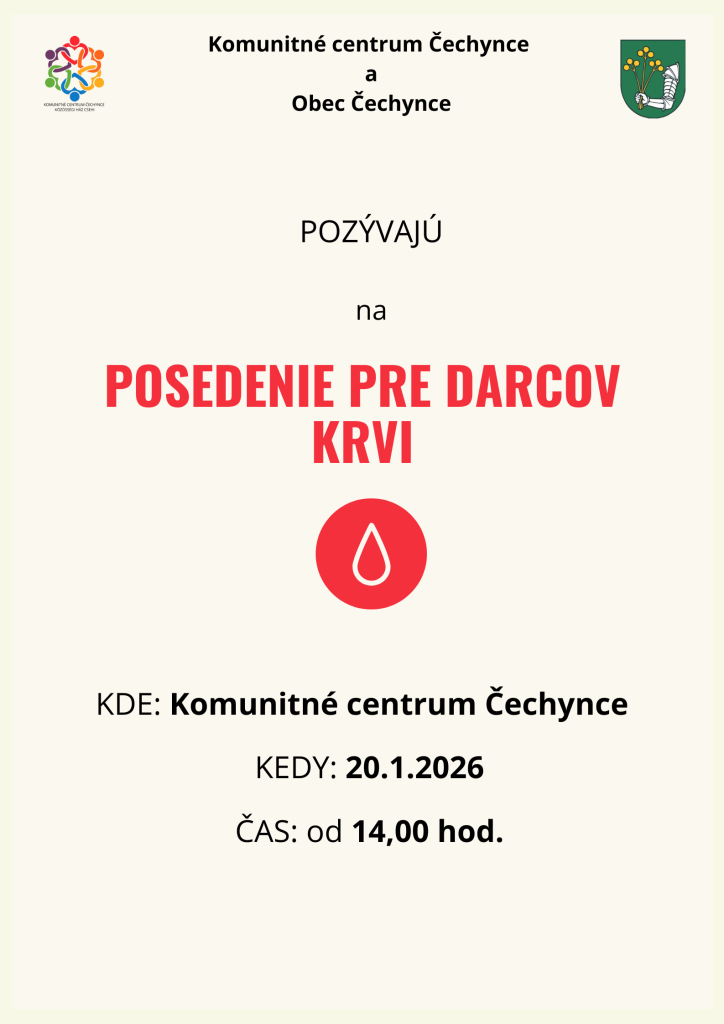 Odber krvi mobilnou jednotkou Národnej transfúznej služby (NTS) sa v našej obci sa uskutočnil už druhý krát 20.1.2026 v príjemných priestoroch miestneho komunitného centra. Sme veľmi radi, že darovanie krvi v našej obci je pre niektorých občanov už samozrejmosťou a prišli opäť. Ale medzi darcami boli aj občania, ktorí prišli darovať svoju krv po prvý krát. Boli statoční, prekonali svoje obavy a strach a krv darovali.