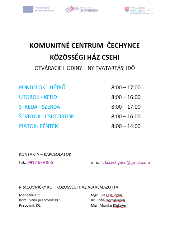 Otváracie hodiny Komunitného centra v Čechynciach