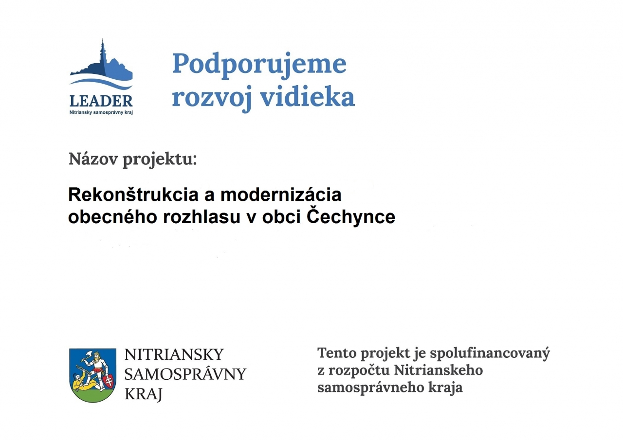Celkový cieľ projektu je zvýšenie kvality informovanosti občanov. Zavedením obecného rozhlasu do novovybudovaných ulíc, kde doteraz rozhlas absentoval dosiahneme zlepšenie komfortu občanov pri informovaní. Bezdrôtový rozhlas s digitálnym kódovaním pre ozvučenie obcí a miest je veľmi spoľahlivé zariadenie pre vyrozumenie obyvateľov a spĺňa všetky požiadavky na kvalitné šírenie frekvenčne modulovaného signálu v nových lokalitách obce Čechynce, kde nie je ešte vybudovaný miestny rozhlas, a to v dvoch novovybudovaných lokalitách „Krátke“ a „Pažiť“. Projekt spočíva vo výmene starej rozhlasovej ústredne za nové vysielacie pracovisko s CD prehrávačom a anténou s držiakom, ktoré umožňujú proces hovorovej reči a hudby. Systém bude chránený voči náhodnému alebo zámernému preniknutiu do systému cudzou osobou. Jedná sa o montáž vonkajších bezdrôtových hlásičov na stĺpy verejného osvetlenia spolu s akustickými prvkami (reproduktory) v lokalite Krátke a Pažiť. V lokalite Krátke sa jedná o nasledovné ulice : Ulica Eugena Gajdára, Záhradnícka ulica, Ulica pri Starom potoku, Nitrianska ulica. V lokalite Pažiť sa jedná o nasledovné ulice: Ulica na Pažiti, Lesná ulica, Ulica pri jazere I.
