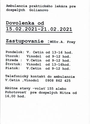 Oznam o čerpaní dovolenky -obvodný lekár pre dospelých v Golianove