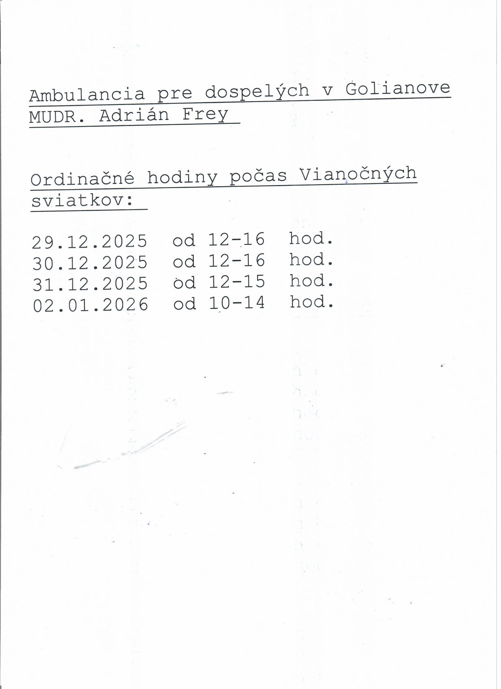Ambulancia pre dospelých - Golianovo - ordinačné hodiny