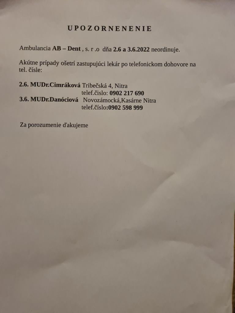 Oznam Ambulancie AB-Dent, s.r.o. Golianovo