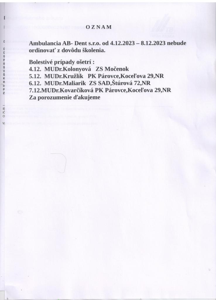 Oznam Ambulancie AB-Dent s.r.o. Golianovo