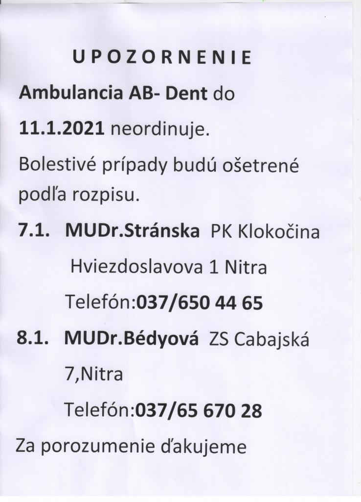 Oznam Ambulancie AB - Dent ,s.r.o. Golianovo