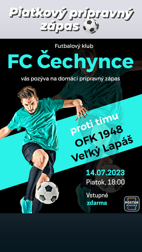 "Futbalový klub FC Čechynce vás pozýva na prípravný zápas, ktorý sa uskutoční najbližší piatok, 14.-ho júla, o 18:00, na domácom ihrisku. Súperom našich futbalistov bude mužstvo OFK 1948 Veľký Lapáš. Všetci ste srdečne vítaní."
