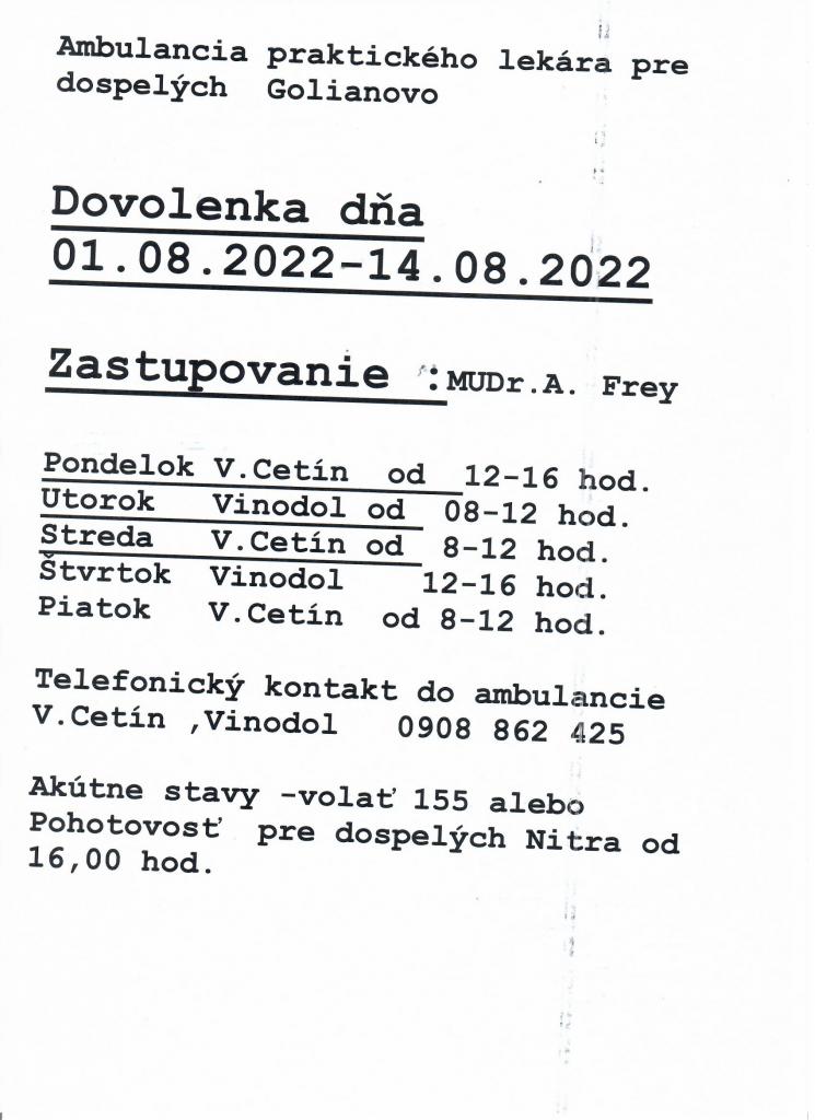 Oznam obvodného lekára pre dospelých v Golianove - a körzeti orvos hirdetése