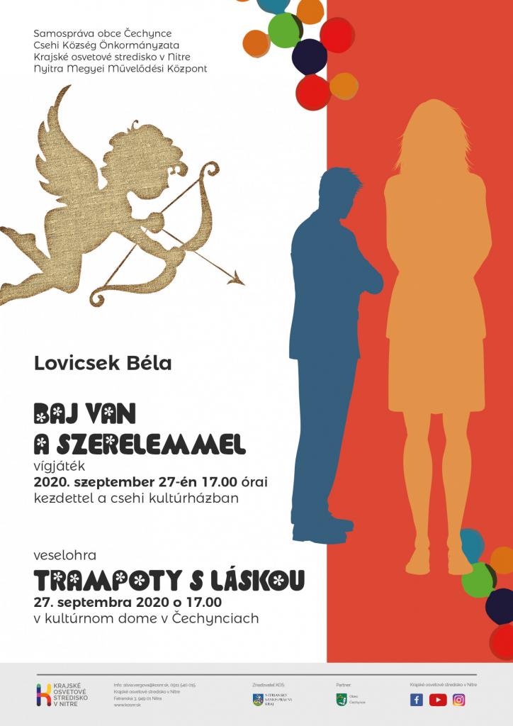 Obec Čechynce a Krajské osvetové stredisko v Nitre Vás srdečne pozývajú na divadelné predstavenie-veselohru v maďarskom jazyku - Lovicsek Béla – TRAMPOTY S LÁSKOU - do kultúrneho domu v Čechynciach dňa 27. septembra 2020 o 17.00 hod.