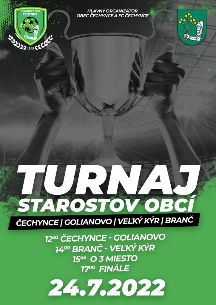 Samospráva Obce Čechynce a FC Čechynce Vás srdečne pozývajú na futbalový turnaj o „Putovný pohár starostov obcí - Branč-Čechynce-Golianovo-Veľký Kýr“ dňa 24. júla 2022 o 12,30 hod.