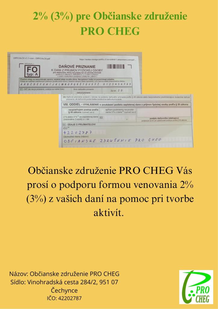 Darovaním 2 % zo zaplatenej dane z príjmov právnických a fyzických osôb (podnikateľov i zamestnancov) pomôžeš OZ Pro Cheg Čechynce a zároveň organizáciám (FC Čechynce) a inštitúciám (MŠ a ZŠ Čechynce) v našej obci , chvíľka času ktorá Vás nič nestojí a má zásadný dopad na činnosť týchto organizácií, inštitúcií ktorí to potrebujú. Získané finančné prostriedky budú použité na podporu podujatí v našej obci. OZ Pro Cheg Vaše 2% využije na 100%.